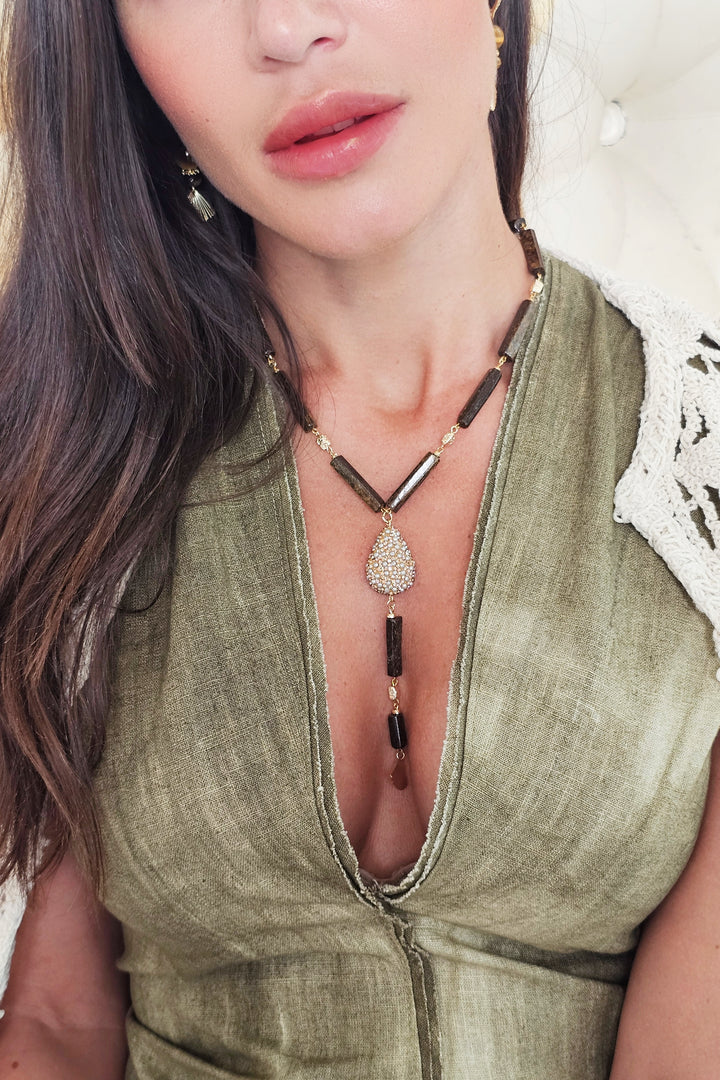 The Y-shaped design of the necklace, complemented by rhinestone tassels, adds an elegant touch to any outfit. The arrangement of the tiger-eye beads creates a visually appealing pattern that draws attention and showcases the stone's natural beauty. Additionally, the rhinestones provide a sparkle that elevates the overall aesthetic, making it a versatile accessory for both casual and formal occasions. This combination of beauty and functionality makes the necklace not just a fashion statement but also a piece that carries meaningful properties.