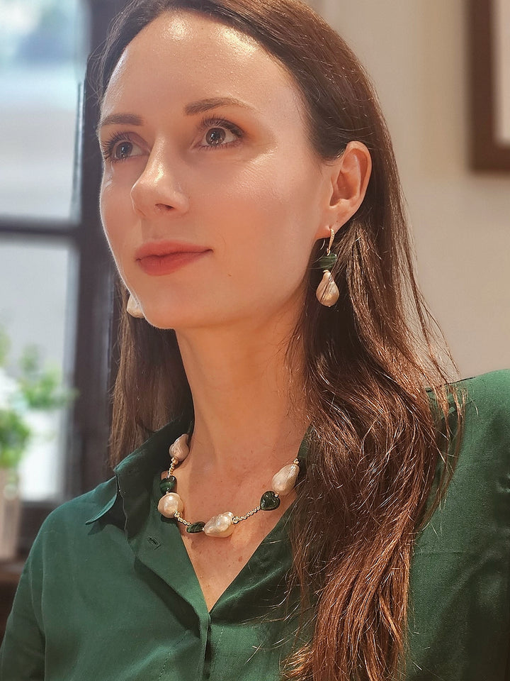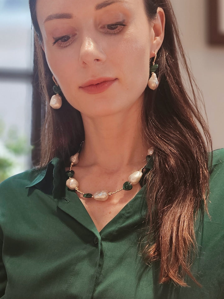 Ideal as a heartfelt gift for mothers, this necklace carries a special significance. Baroque pearls are often associated with wisdom and purity, while malachite is believed to offer protection and emotional healing. Together, they create a meaningful piece that not only enhances any outfit but also carries a message of love and support.