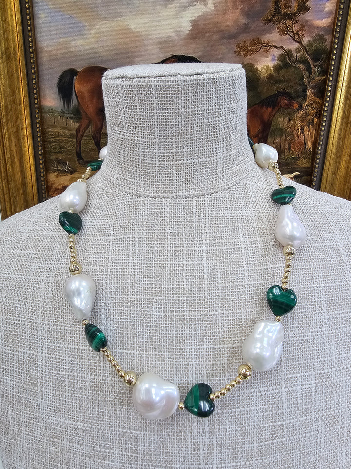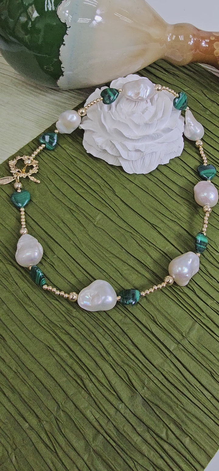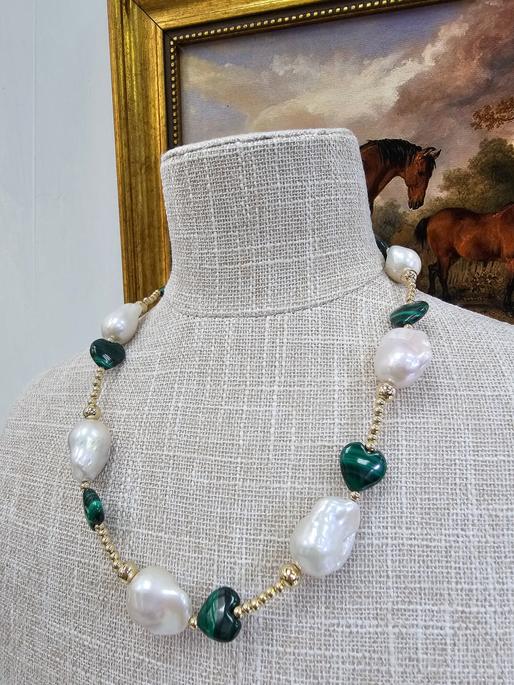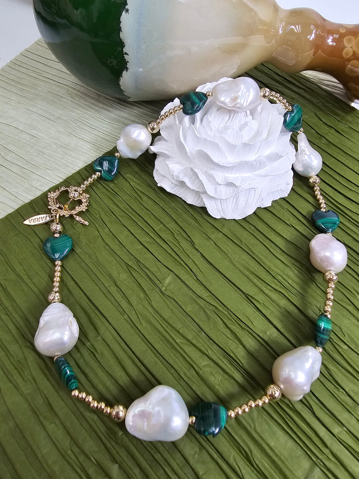 Featuring lustrous baroque pearls, each with its unique shape and iridescence, this necklace exudes a sense of individuality and charm. At its center, a heart-shaped malachite stone adds a vibrant touch of green, symbolizing energy and transformation. This necklace is perfect for those who appreciate the beauty of nature and the balance it brings.