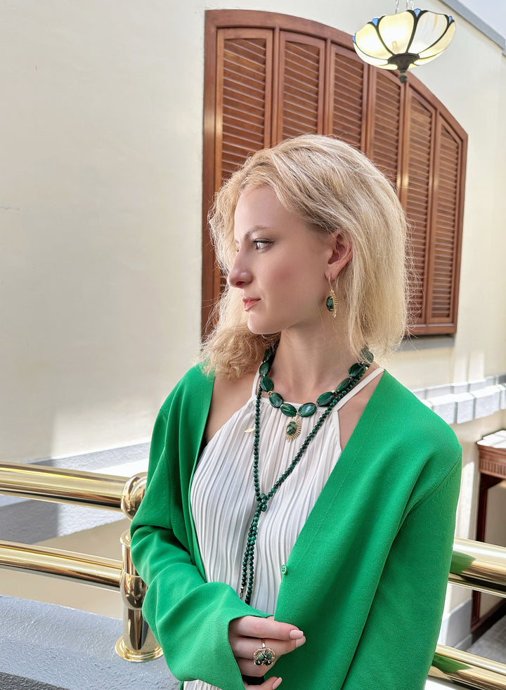 Faites une déclaration avec le collier ouvert en malachite. Créez votre propre style en enroulant deux fois ou en nouant le collier, parfait à associer avec une robe ou un haut tricoté en toute occasion. Cette magnifique pièce ne manquera pas de faire tourner les têtes, rayonnant de sophistication et d'élégance. Il sera contenu dans une jolie boîte à bijoux bien emballée.