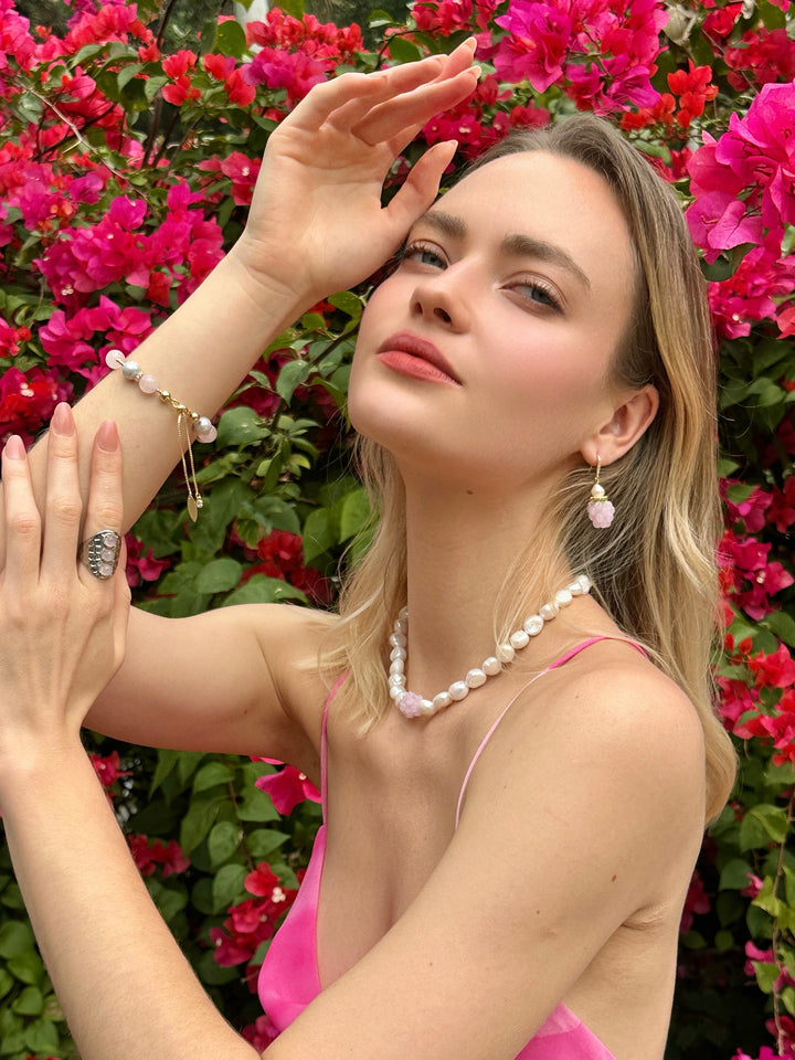 The necklace features lustrous irregular freshwater pearls, each with its own unique shape, size, and texture. The pink raspberry glass pendant adds a playful touch and a pop of energy, reminiscent of the joyous spirit of summer.