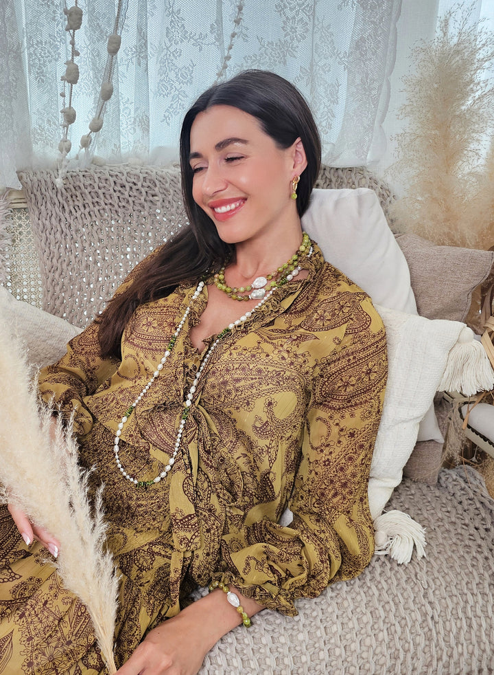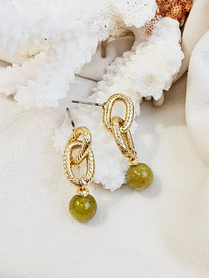 It is a chic and contemporary accessory that adds a touch of elegance to any outfit. These earrings feature vibrant green opal stones, known for their uplifting energy and connection to nature. Each opal bead is beautifully suspended from a sleek, modern design that combines clean lines with a playful twist.