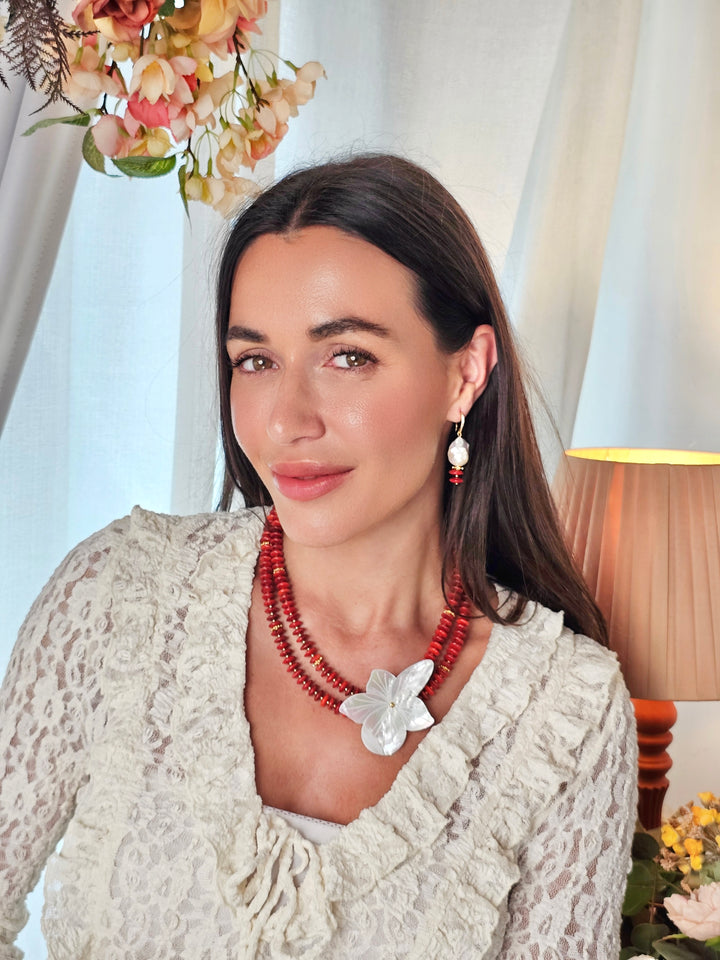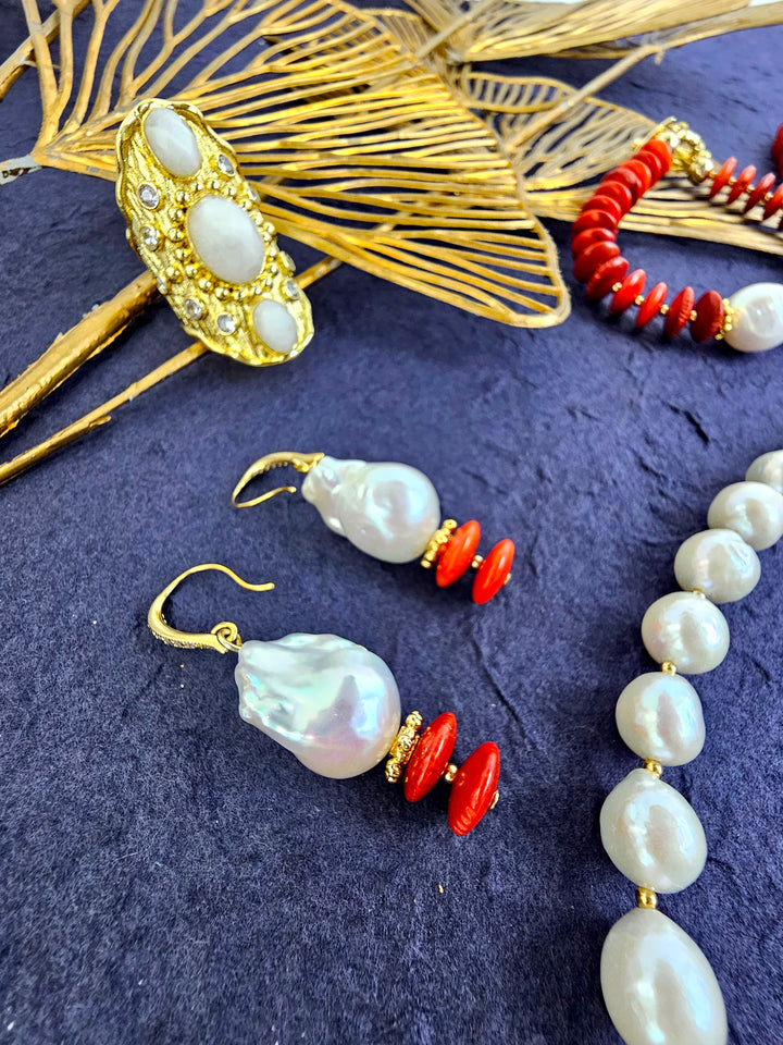 The Baroque Pearl with Red Bamboo Coral Earrings present a stunning fusion of natural beauty and vibrant color. Each earring features a uniquely shaped baroque pearl, celebrated for its irregular form and lustrous sheen, which adds an element of sophistication. Below the pearl, two striking red bamboo coral beads provide a bold contrast, enhancing the earrings' overall visual appeal.