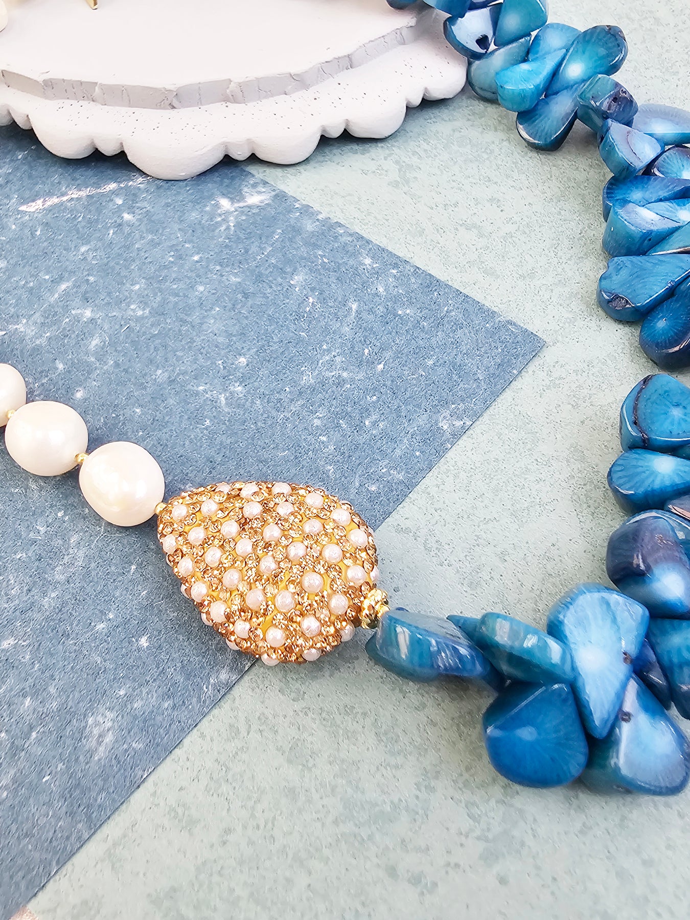 Freshwater Pearls & Floral Blue Bamboo Coral Necklace QN029