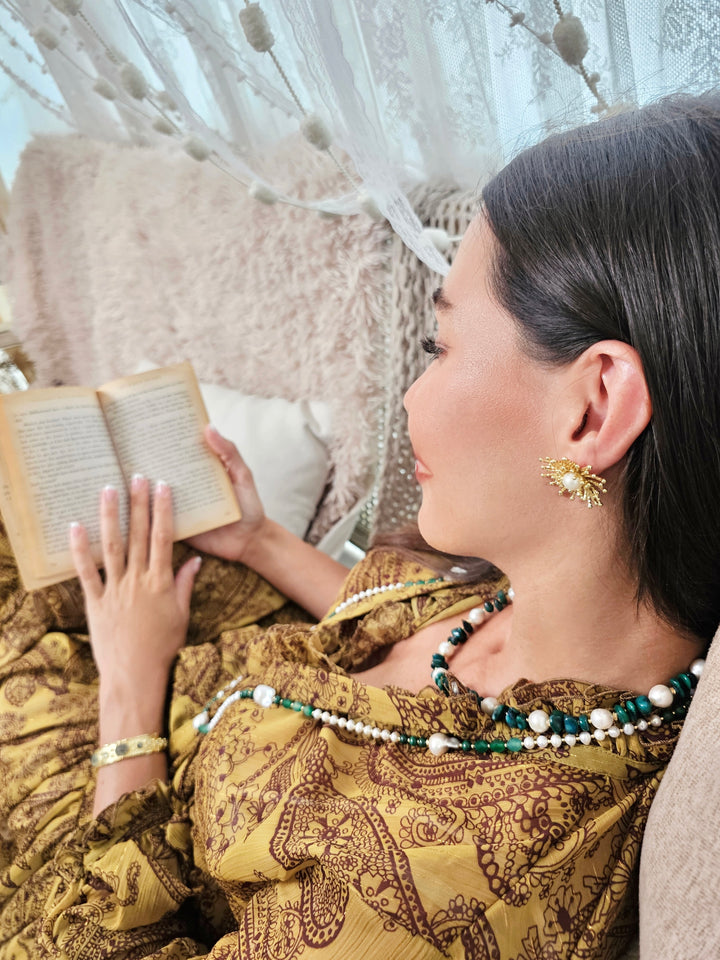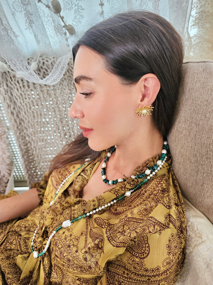 This stunning piece features a beautiful combination of vibrant green bamboo coral and lustrous freshwater pearls, creating a striking contrast that captures attention.