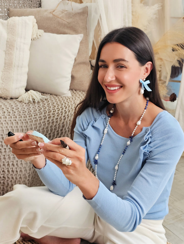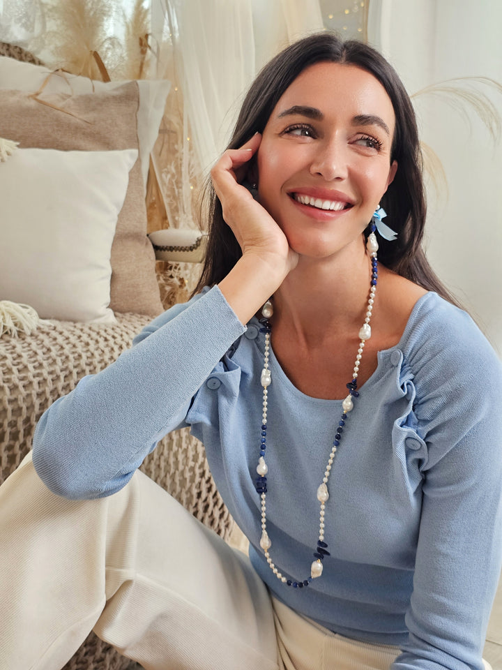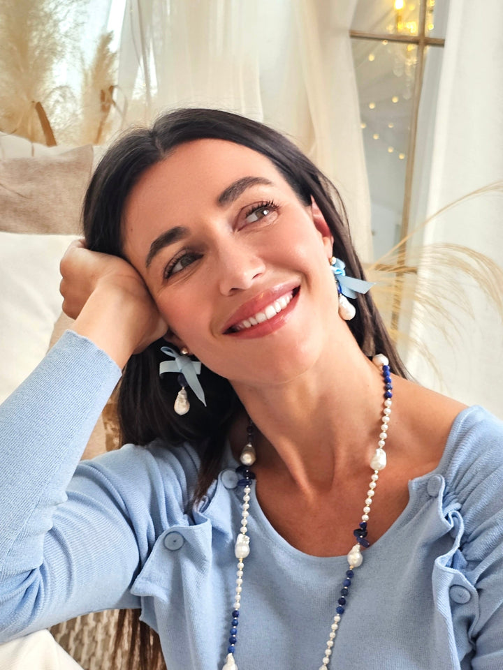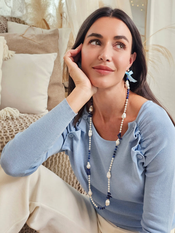 These charming earrings feature unique baroque pearls, known for their organic shapes and lustrous finish, elegantly complemented by rich blue lapis beads. The standout element is the delicate blue silk bowknot that adds a playful and feminine flair, making these earrings perfect for both casual outings and special occasions.