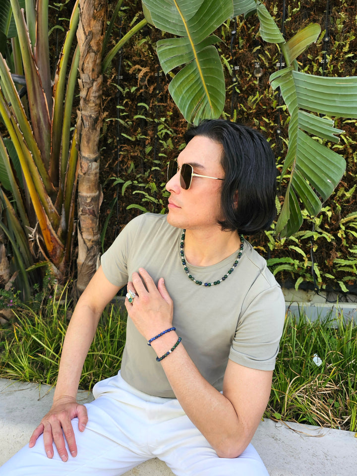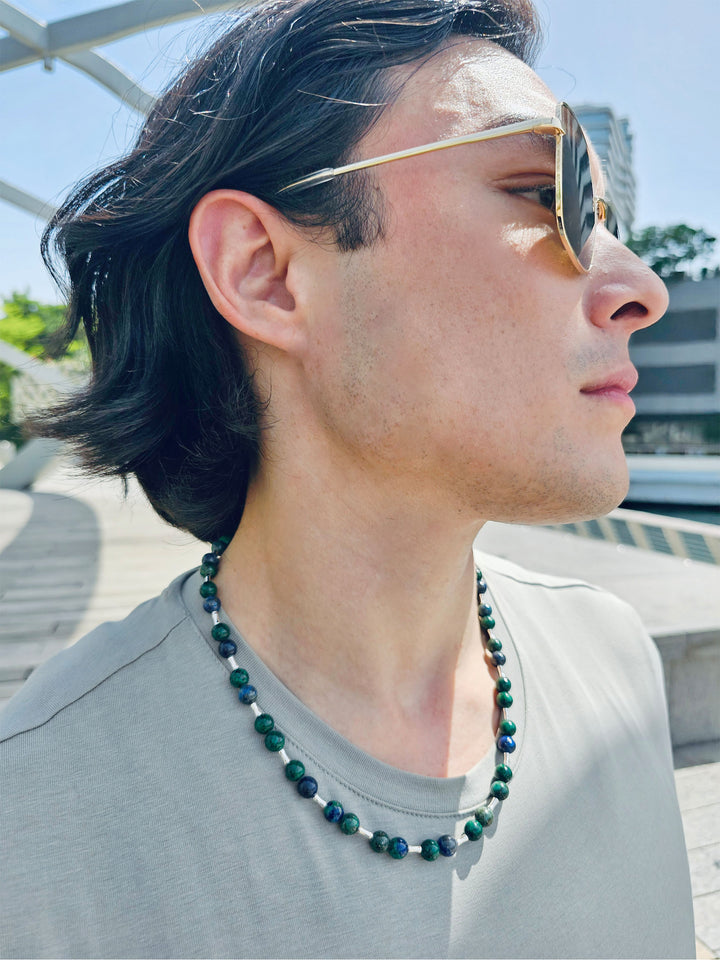 It is a striking blend of natural beauty and modern design. The vibrant green hues of malachite, with its unique banded patterns, symbolize transformation and renewal, making it a powerful stone for personal growth. Known for its protective qualities, phoenix lapis is believed to absorb negative energies and promote emotional healing. Paired with sleek sterling silver tubes, this necklace creates a sophisticated look that stands out in any setting.