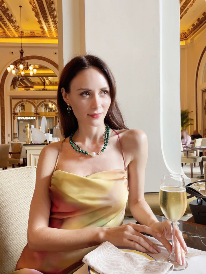 Ce collier double brins fait main est composé de malachites avec des perles baroques et des perles bordées de strass avec des accessoires en laiton plaqué or du Japon. C'est beau et spécial qui peut être porté avec une robe, des tricots ou un denim pour toute occasion. Il sera contenu dans une jolie boîte à bijoux bien emballée. C'est également un très beau cadeau pour un anniversaire, un anniversaire ou un festival.