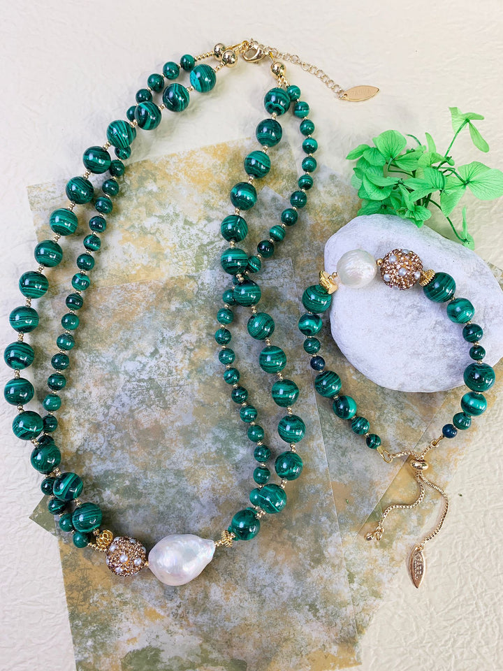 Baroque Pearl With Malachite Double Strands Statement Necklace GN015 - FARRA