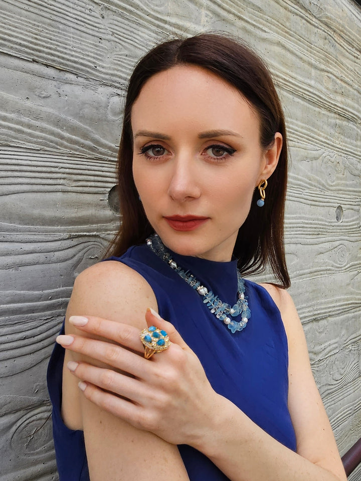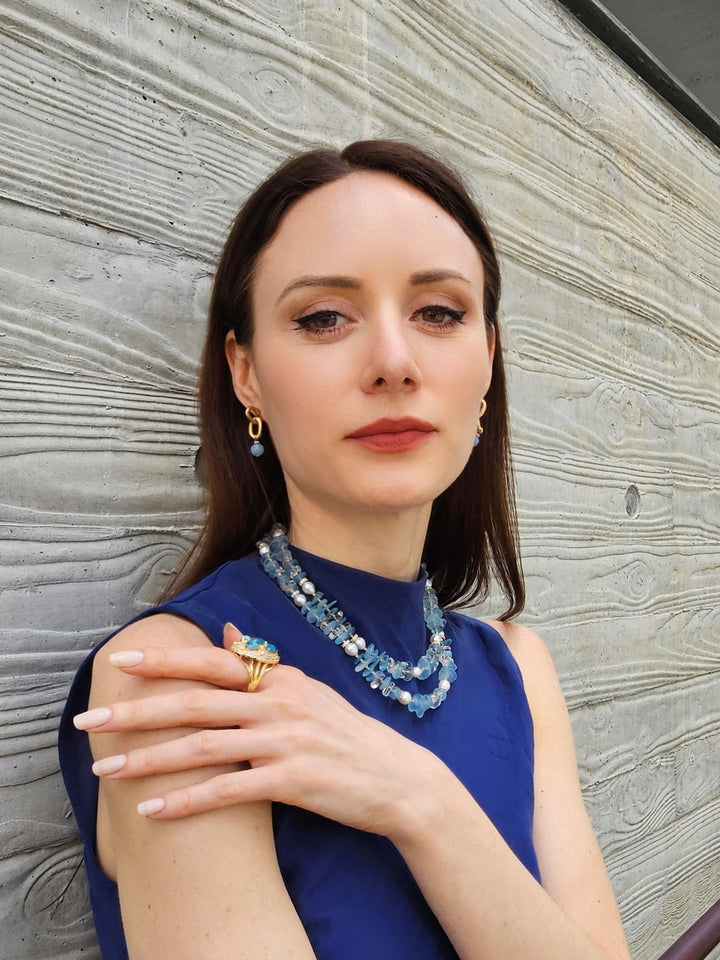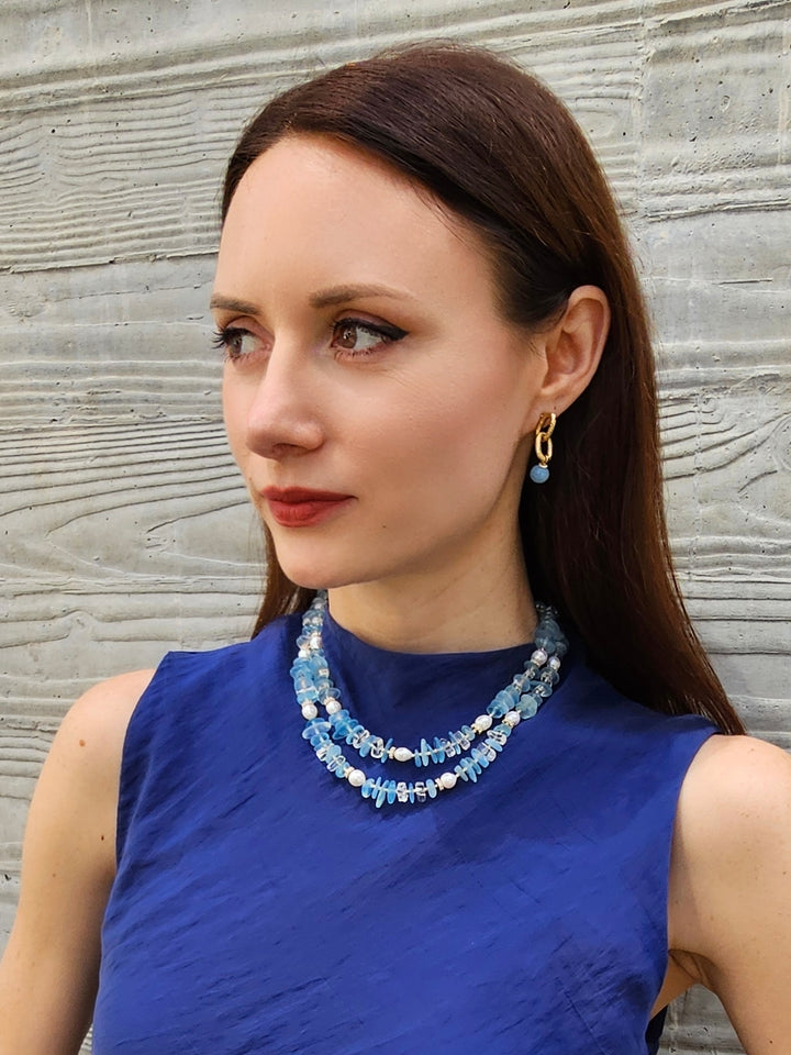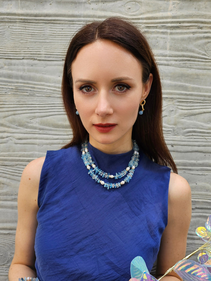 This exquisite piece features two layers of stunning aquamarine gemstones and lustrous freshwater pearls, elegantly arranged to create a captivating visual impact.