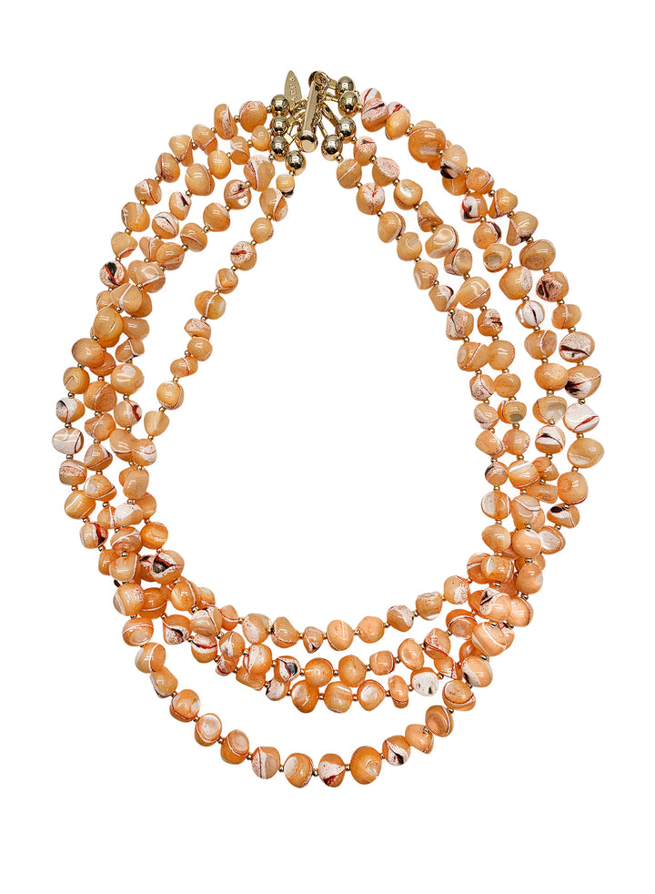This eye-catching piece features multiple layers of beautifully crafted natural shells in vibrant orange hues, creating a stunning visual display that exudes warmth and energy.