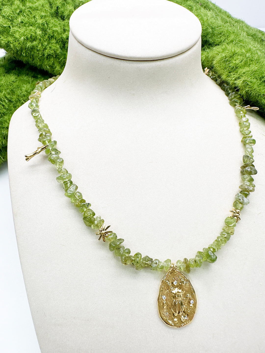 This necklace features a captivating irregular peridot gemstone. Each stone is carefully selected for its vibrant green hue and distinctive shape, ensuring that no two necklaces are exactly alike. The irregular cut of the peridot adds an artistic touch, creating a truly one-of-a-kind piece.