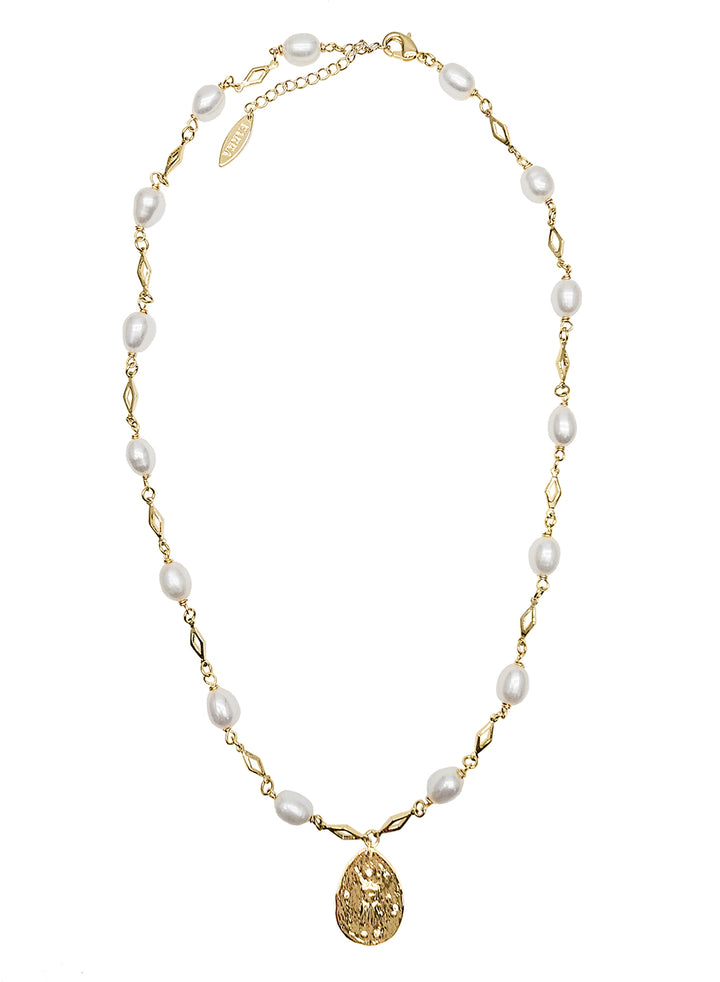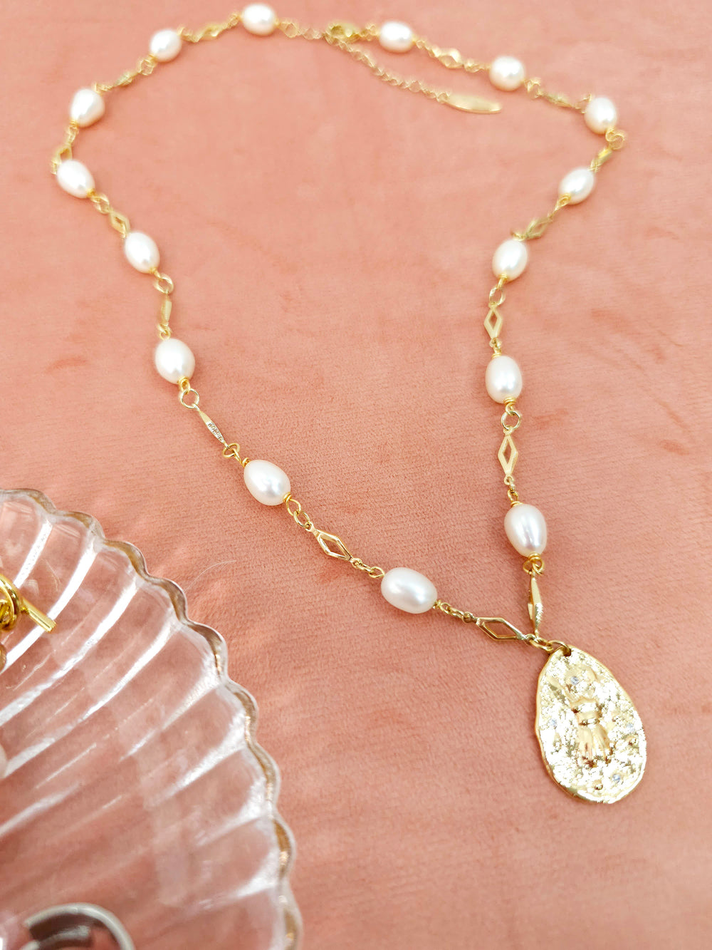This exquisite piece features lustrous freshwater pearls, each unique in shape and color, elegantly strung together to create a timeless design. The standout feature is the intricate insect pendant, crafted from high-quality 14K gold plated brass. This combination of natural beauty and artistic flair makes the necklace a perfect accessory for any occasion, whether you're dressing up for a night out or adding a touch of elegance to your everyday look.