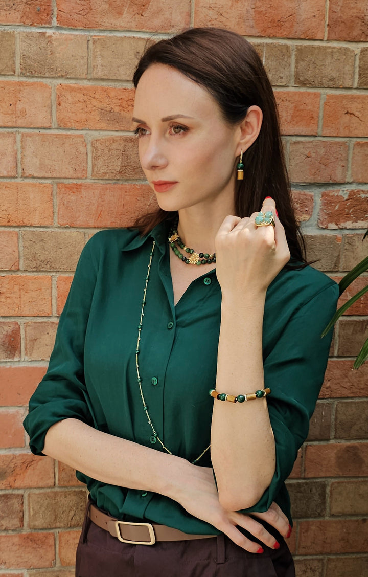 Materials: Natural malachite, golden coral, zircon, 14K gold plated brass