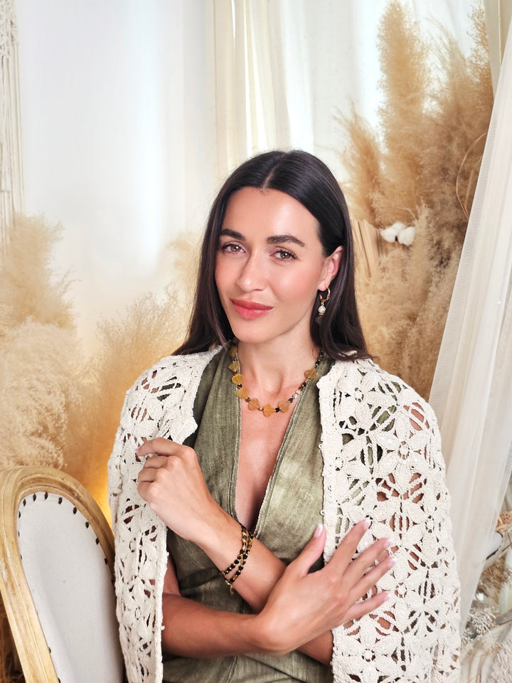 This stunning piece features a harmonious arrangement of polished citrine stones and unique heart-shaped tiger-eye beads. The vibrant yellow hues of the citrine evoke feelings of positivity and joy, known for its ability to promote clarity of thought and attract abundance. Meanwhile, the rich, earthy tones of the tiger-eye add depth and texture, celebrated for its protective qualities and ability to enhance confidence and focus.