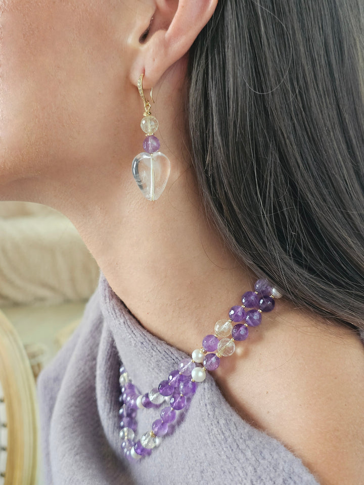 These charming heart-shaped white quartz earrings are beautifully complemented by amethyst beads, creating a lovely and romantic accessory. The clear white quartz, known for its clarity and healing properties, forms the heart shape that symbolizes love and compassion.