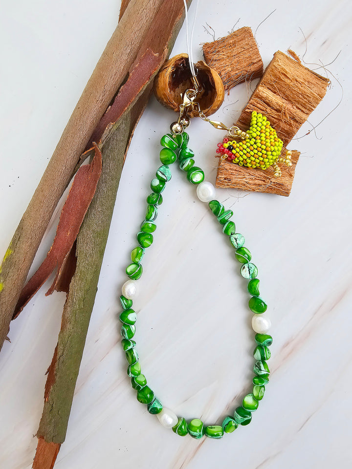 This playful piece features a vibrant green shell, beautifully complemented by elegant white freshwater pearls and a charming beaded chicken. Perfect for those who love to express their unique personality while keeping their phone secure.