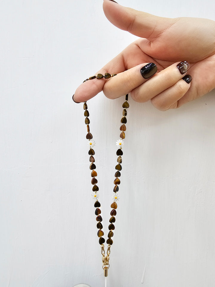 This phone strap is designed for versatility and ease of use, featuring two clasps that securely hold your phone while preventing accidental drops. Simply close the two clasps together, and it transforms into a chic choker, allowing you to express your individuality in multiple ways. The heart-shaped tiger eye is renowned for its protective properties, promoting confidence, courage, and clarity, while the intricate flower shell adds a touch of nature-inspired elegance.