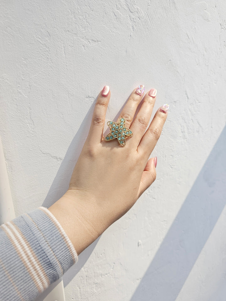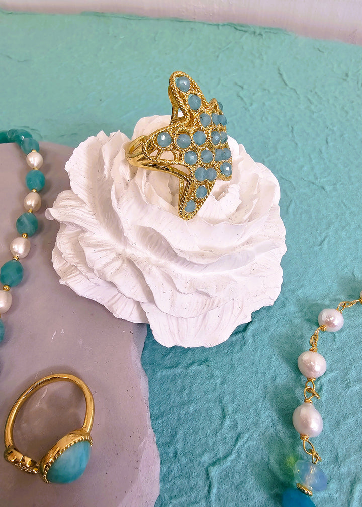This stunning ring features a unique star shape adorned with beautiful amazonite stones, known for their calming blue-green hue. The intricate gold-toned setting enhances the natural beauty of the stones, making this piece a striking addition to any jewelry collection.