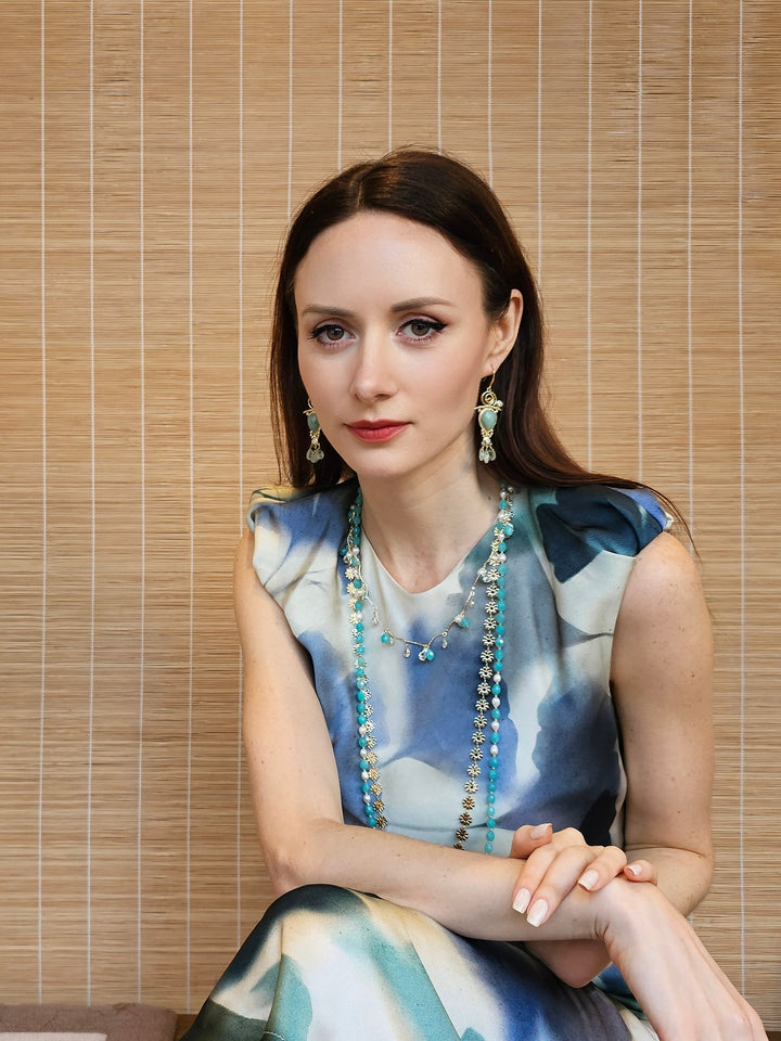 This exquisite piece features beautiful amazonite stones, known for their soothing colors and calming properties, elegantly paired with a delicate flower chain design.