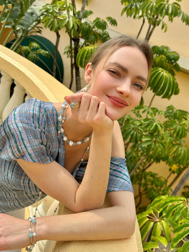 A versatile piece that can also be worn as a choker necklace. This stunning accessory combines the natural beauty of aquamarine beads with the unique charm of baroque pearls. Each baroque pearl is unique, displaying its own individual characteristics, making this bracelet a truly one-of-a-kind accessory.