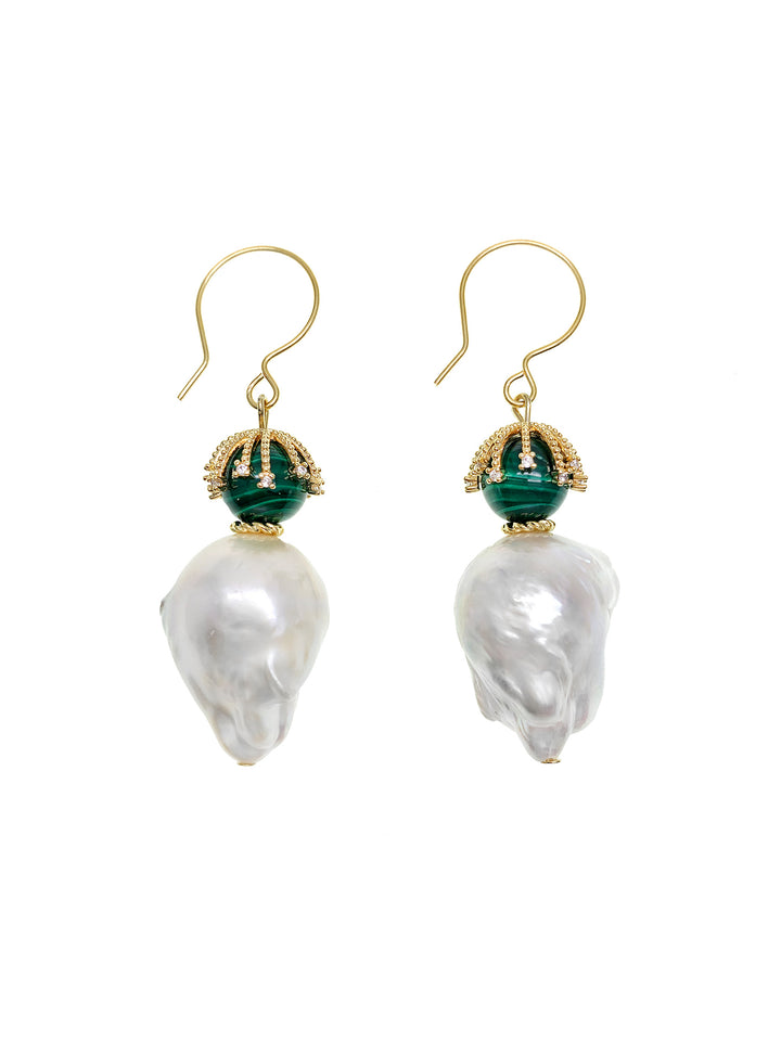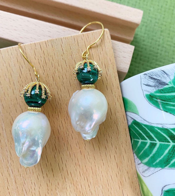 Ces boucles d'oreilles faites à la main sont composées de perles baroques et de malachite avec des accessoires en laiton plaqué or du Japon. C'est beau et élégant qui peut être porté avec une robe, un chemisier ou un tricot de jour comme de nuit en toute saison. C'est également un cadeau très spécial pour un anniversaire, un anniversaire ou un festival. Il sera contenu dans une jolie boîte bien emballée.